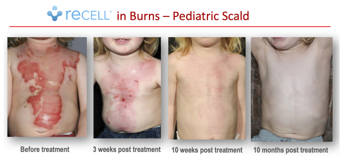 美国一位2岁小女孩,胸部和腹部严重烧伤。很幸运,小女孩在UMCNO烧伤中心医疗主任Dr Jeffrey E Carter建议下,接受了RECELL技术治疗。治疗后12天完全痊愈,10个月后,胸部和腹部的皮肤跟烧伤之前的皮肤并无差异。