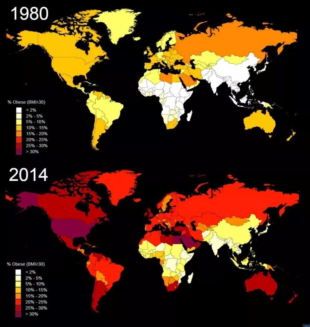 事实上,自19世纪80年代前后,世界各国的肥胖率,几乎无一例外的都在上升。全部呈现飞速高涨的态势。