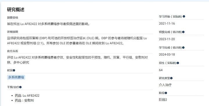 Lu AF82422: 这是一种人单克隆抗体,针对有毒的α-突触核蛋白,这是MSA的致病特征。它通过与人体的天然免疫系统相似的方式来清除这些有毒蛋白质,可能会减缓MSA的进展。