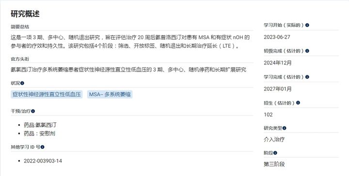 ampreloxetine: 这是一种去甲肾上腺素再摄取抑制剂,正在研发用于治疗有症状的神经源性直立性低血压(nOH)患者。它目前正在进行临床试验,预计将为MSA患者提供新的治疗选择。